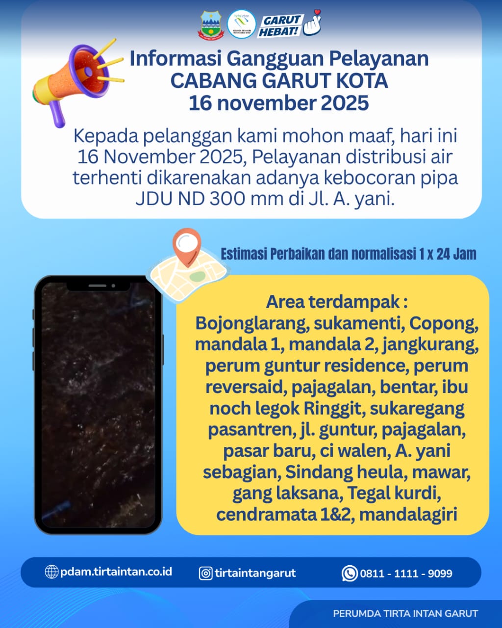 Selain menyampaikan permohonan maaf, PDAM juga mengimbau masyarakat agar tetap tenang dan bijak menggunakan cadangan air selama proses perbaikan berlangsung. Pelanggan juga dipersilakan menghubungi layanan pengaduan resmi PDAM Tirta Intan Garut di 0811–1111–9099 atau akun Instagram @tirtaintangarut apabila memerlukan informasi tambahan.